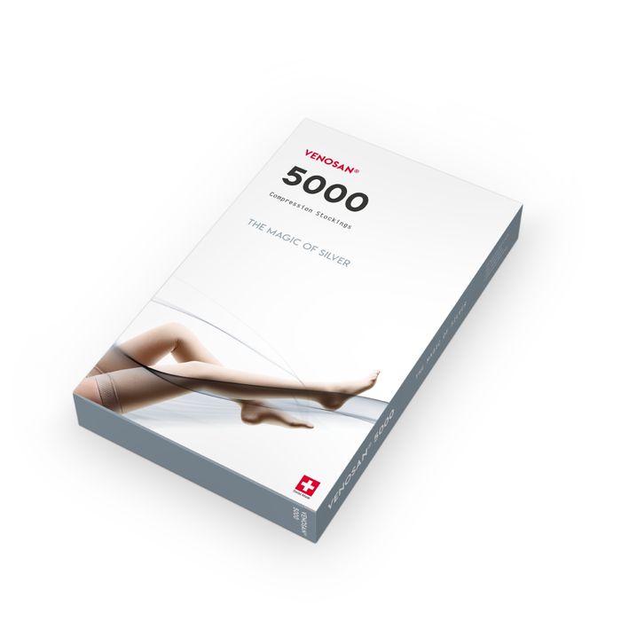VENOSAN 5000 COMPRESSION STOCKINGS CLASS 1 18-21 mmHg PRODUCT HIGHLIGHTS-MAGIC OF SILVER The premium product for those with higher expectations. oPure silver- contains silver-coated X-Static fibre. No reduction of the properties of silver even after 150 washing cycles. oHeat conductive- silver is well known for its excellent heat conductive properties.In combination with the microfibre TACTEL, silver produces rapid dissipation of skin moisture. oDurable- suitable for active men and women, thanks to the innovative yarn combination of silver and cotton. COMPOSITION 40 % TACTEL Polyamide | 30 % Elastane | 20 % Cotton | 10 % X-Static - The Silver Fiber TACTEL fibre is a registered trademark of INVISTA and is used under license to NILIT for nylon fibre products.